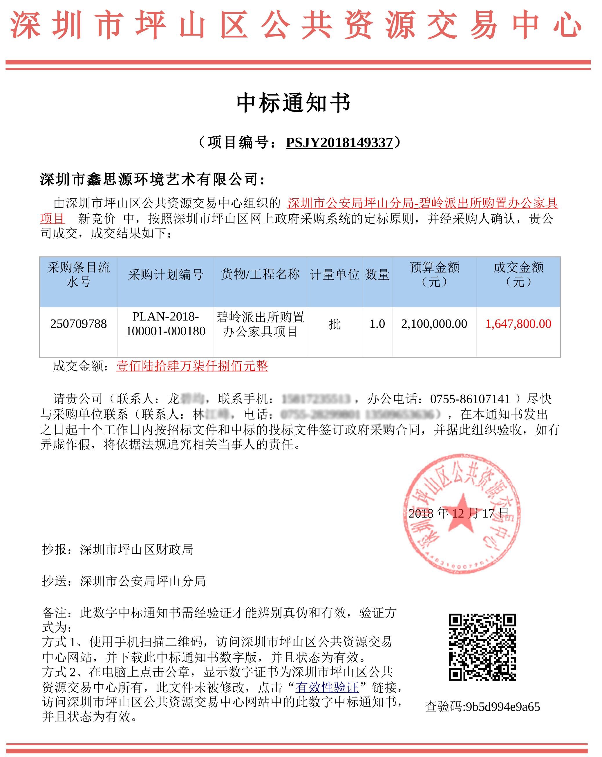 深圳市公安局坪山分局-碧嶺派出所辦公家具采購中標通知書: